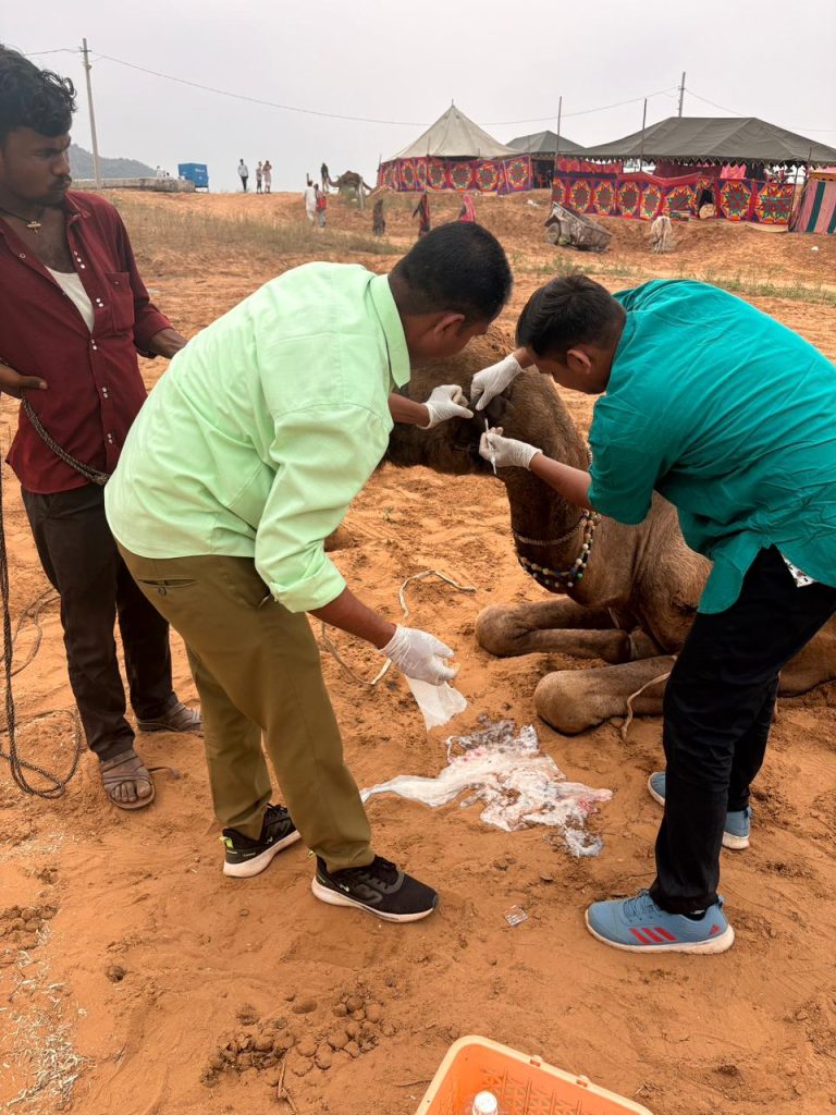 Beyond the annual Pushkar camp, our team runs treatment camps at the Nagaur cattle fair and at Jaisalmer, where camels used in desert tourism receive care they would otherwise have no access to. These camps are where the scale of unmet veterinary need is most visible.